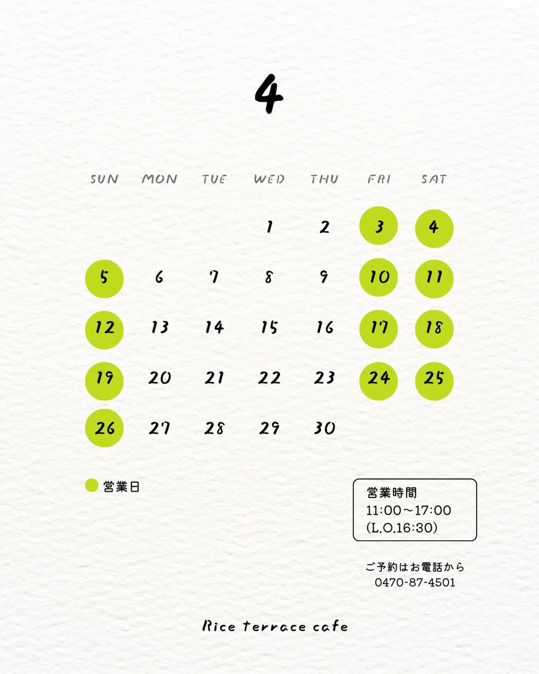ライステラスカフェ4月の営業日のご案内